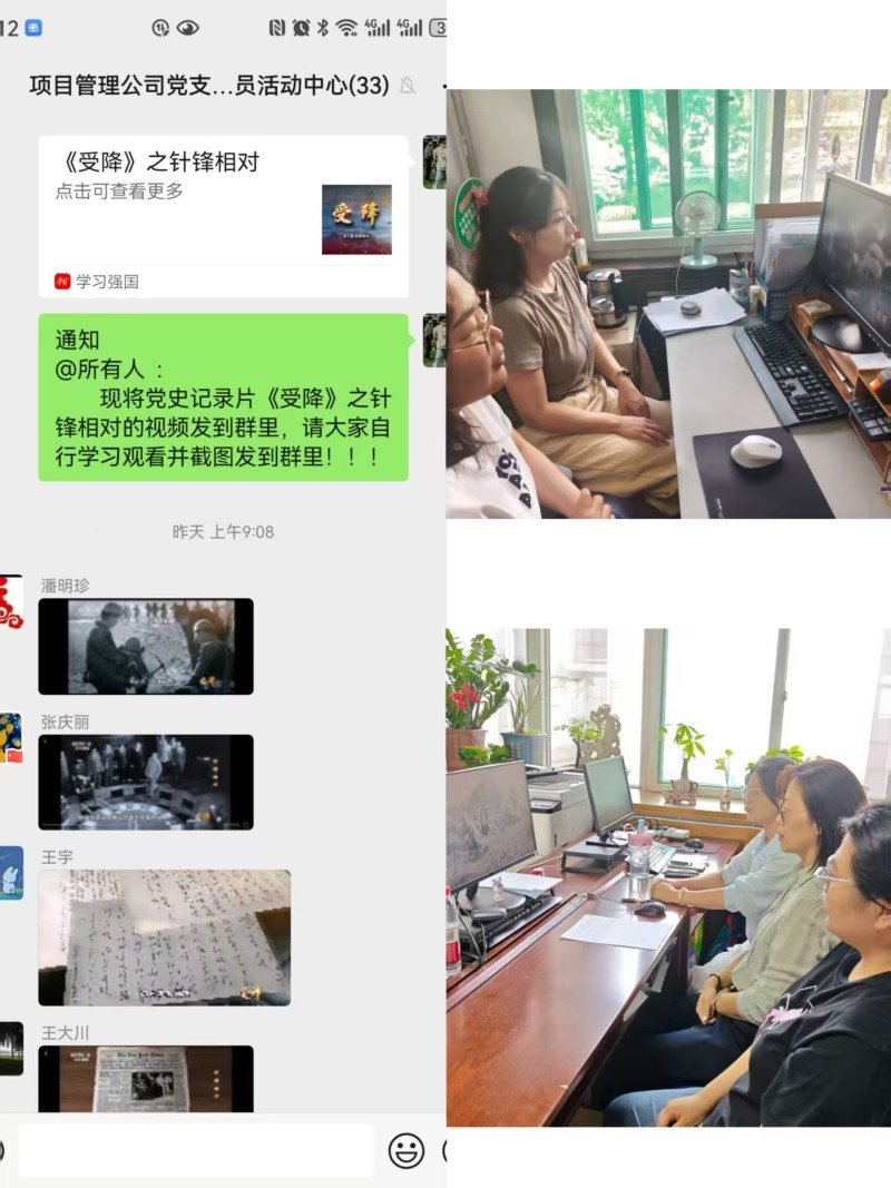 9月1日,項目管理公司黨支部開展“重溫歷史 奮勇爭先”主題活動?;顒又?,全體黨員干部共同觀看黨史紀錄片《受降》,紀錄片以詳實的史料、珍貴的影像生動展現(xiàn)中國共產(chǎn)黨始終以人民利益為根本,在復(fù)雜形勢下堅守信仰、運籌帷幄的政治智慧和使命擔(dān)當,引導(dǎo)黨員干部不斷加強黨史學(xué)習(xí),切實把優(yōu)秀歷史經(jīng)驗轉(zhuǎn)化為推動工作的實際行動。